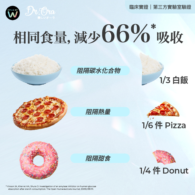- 醫學實證,餐前 20 分鐘飲用後,截擊碳水卡路里 66%