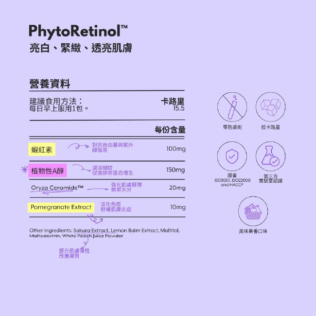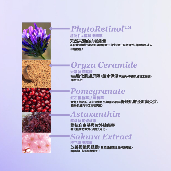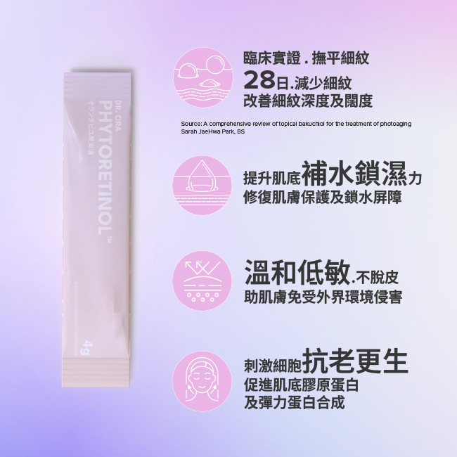 - 富含植物性維他命A Bakuchiol .  讓肌膚從根源啟動修復力